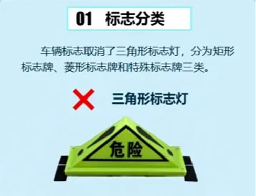 取消舊版三角形標(biāo)志燈,統(tǒng)一使用矩形牌(主標(biāo)識(shí))、菱形牌(輔助標(biāo)識(shí))、特殊標(biāo)志牌(如爆炸品)。
